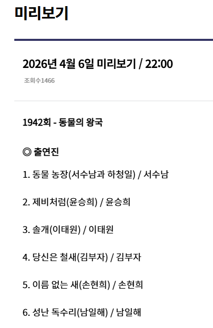 이번 가요무대 1942회는 ‘동물의 왕국’이라는 독특한 주제로 꾸며지며, 색다른 선곡과 무대가 이어질 예정입니다.
